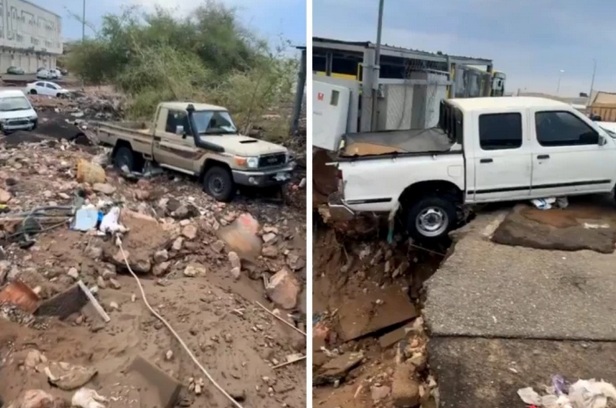 شاهد: انهيار أرضي وتضرر سيارات بعد هطول الأمطار الغزيرة على المدينة المنورة