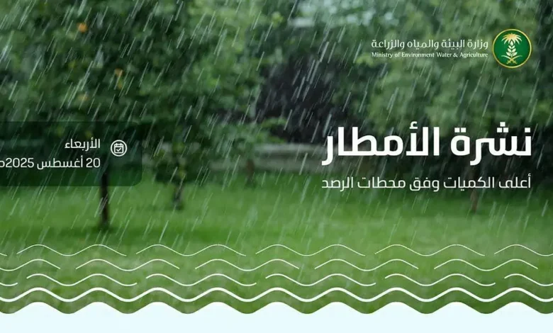 رصدت (80) محطة رصد هيدرولوجي ومناخي هطول أمطار متفرقة في (6) مناطق من الساعة التاسعة صباحًا يوم الثلاثاء 19 أغسطس حتى الساعة التاسعة صباحًا يوم الأربعاء 20 أغسطس 2025م، حيث سجّلت منطقة جازان أعلى معدلٍ لكميات هطول الأمطار بلغت (53.8) ملم في محافظة الدرب، تليها منطقة عسير بكميات بلغت (40.6) ملم في محافظة سراة عبيدة.