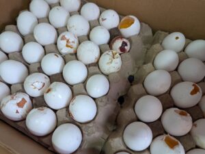 كما أسفرت مداهمة موقعٍ آخر عبارة عن عمارة سكنية مجاورة تُستغل من قِبل عمالة مخالفة لتغليف البيض وتعديل تواريخ صلاحيته، عن مصادرة مكينة تغليف أطباق البيض والعثور على نحو 40 ألف ملصق للمنتج النهائي وختم لطباعة التواريخ، حيث تولّت بلدية الجامعة الفرعية إتلاف جميع المضبوطات.