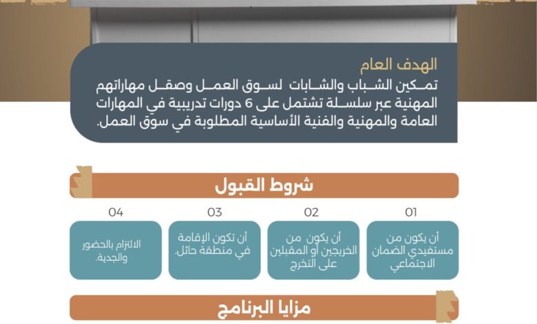 وأوضح القائمون على المبادرة أنها تستهدف أبناء وبنات مستفيدي الضمان الاجتماعي من الخريجين والخريجات أو المقبلين على التخرج، على أن يكون المتقدم من سكان منطقة حائل، مع الالتزام بالحضور والمشاركة طيلة فترة تنفيذ الورش.