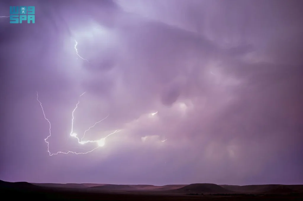 شهدت ضواحي مدينة عرعر بمنطقة الحدود الشمالية اليوم الجمعة، صواعق رعدية مصحوبة بأمطار خفيفة، وما تزال الفرصة مهيأة –بمشيئة الله– لهطول المزيد من الأمطار.