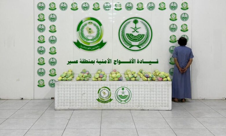 دوريات الأفواج الأمنية بمنطقة عسير تقبض على شخص لترويجه (16) كيلو جرامًا من نبات القات المخدر
