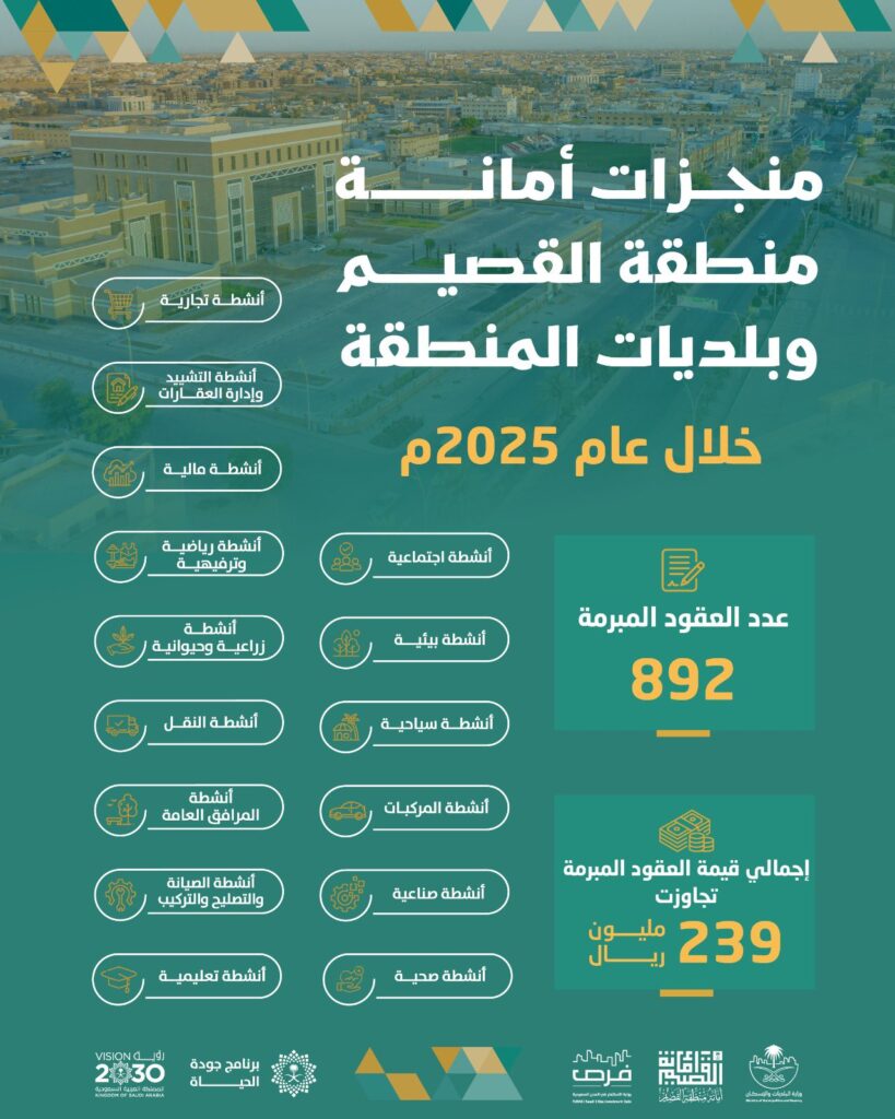 أمانة منطقة القصيم تُبرم 892 عقداً استثمارياً بقيمة تتجاوز 239 مليون ريال خلال عام 2025