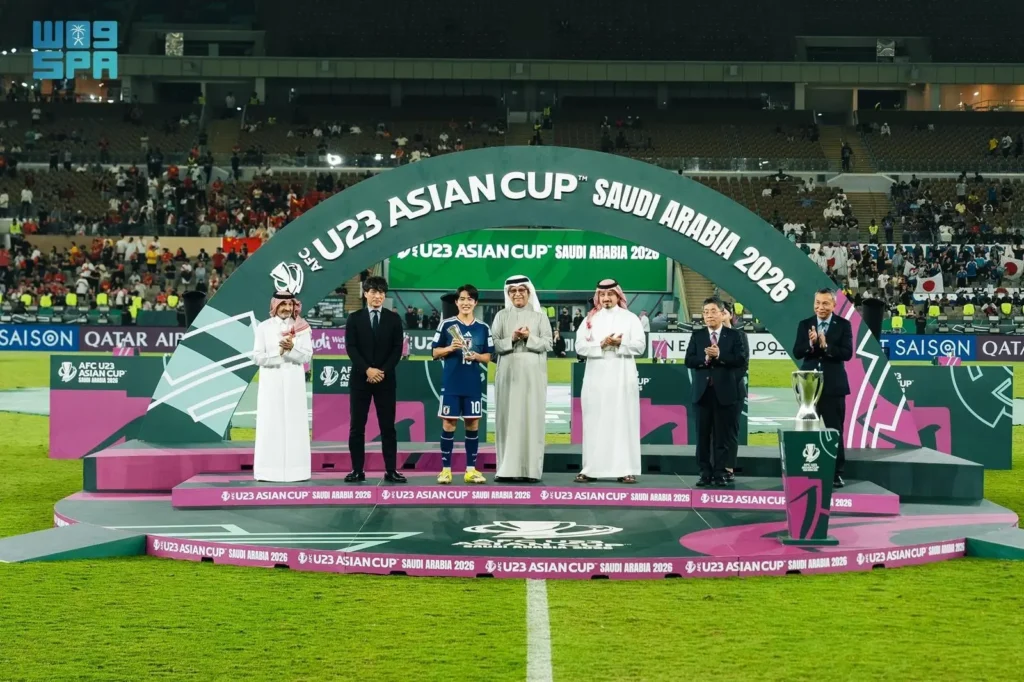 توّج رئيس الاتحاد السعودي لكرة القدم ياسر بن حسن المسحل، المنتخب الياباني بلقب بطولة كأس آسيا تحت (23) عامًا 2026، عقب فوزه الكبير على نظيره المنتخب الصيني بأربعة أهداف دون مقابل، في المباراة النهائية التي أُقيمت اليوم على ملعب مدينة الأمير عبدالله الفيصل الرياضية بجدة.