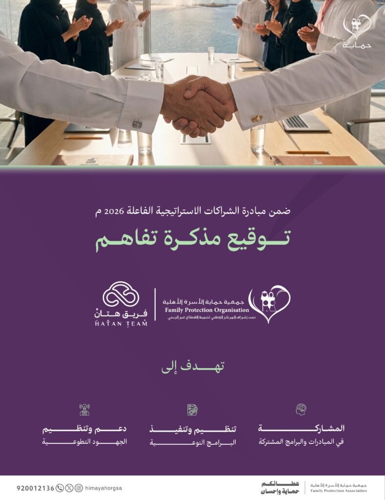 في إطار تعزيز التكامل بين القطاعات غير الربحية وتمكين العمل المجتمعي والتطوعي، وقّعت جمعية حماية الأسرة مذكرة تفاهم مع فريق هتان سحب، بهدف توحيد الجهود وتطوير المبادرات النوعية التي تخدم الأسرة والمجتمع.